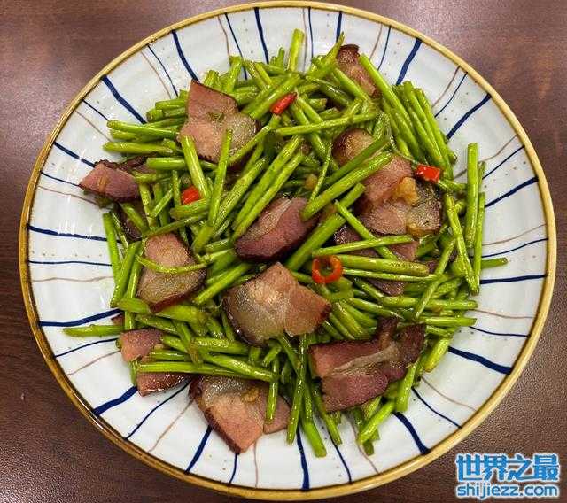 藜蒿炒腊肉是江西南昌地区的特色名菜。藜蒿长在江西的鄱阳湖沿岸较多,在我印象中,因为它属于野生长的,每到它可以摘的季节,就会有很多大人带着袋子去采摘。虽然它要花时间去摘,去洗,但当吃到美食的那一瞬间,藜蒿鲜嫩,微辣气息伴着腊肉就是一大口,就觉得一切都值得啦!