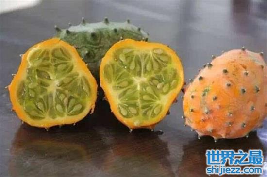 刺角瓜又名非洲角瓜和非洲黄瓜。它有着黄色带刺的外皮,里面的果肉是绿色的。原产于非洲沙漠中, 表皮坚硬,看上去却有点吓人。但是非洲角瓜是很多人最喜欢的水果,肉质十分细腻,就像是像黄瓜一样的凝胶状,清甜又有香味。