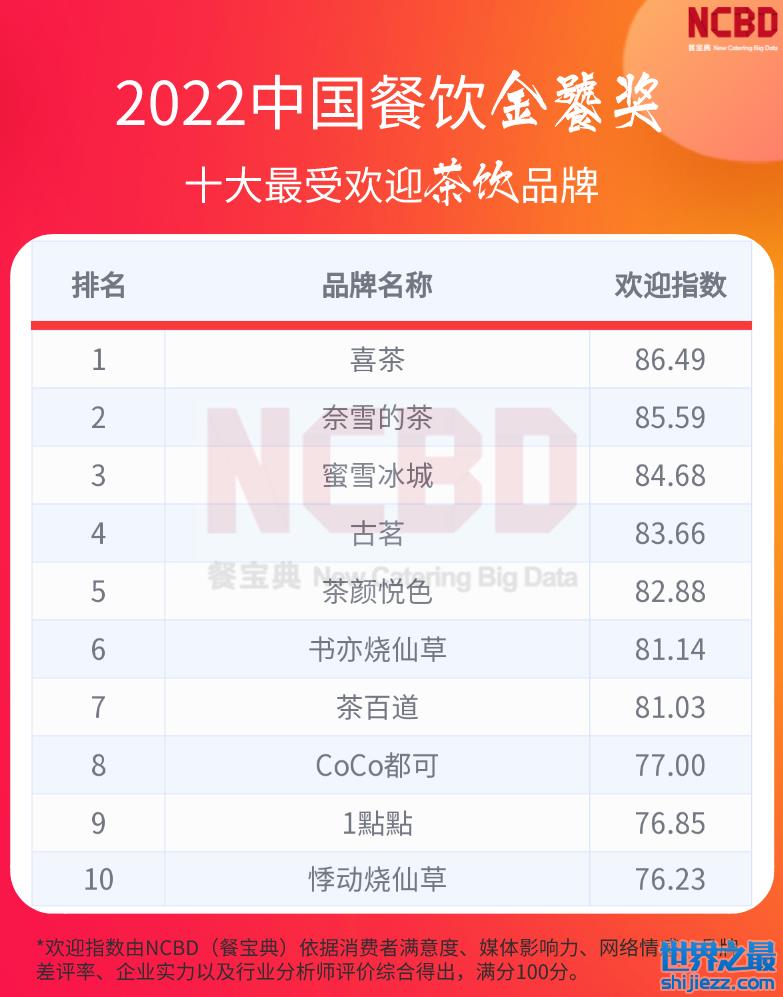 2022中国十大最受欢迎茶饮品牌:喜茶第一,悸动上榜
