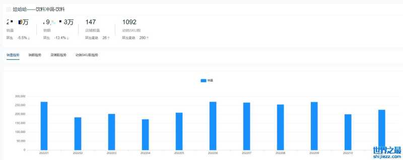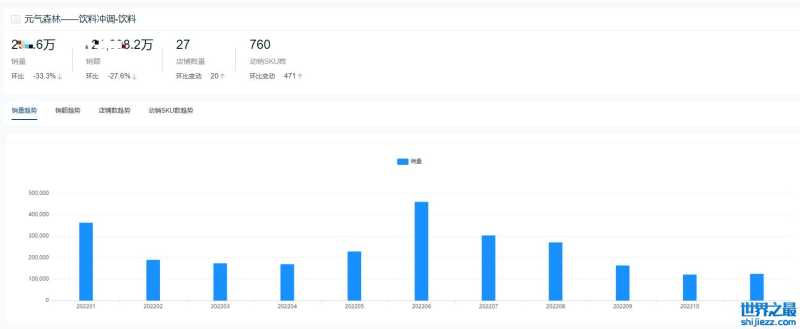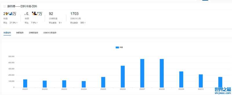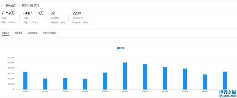 农夫山泉今年整体的排名是第二名,仅次于可口可乐。2022年全年农夫山泉饮料的总销量超737万件,总销售额超4.8亿元。2022年6月份,农夫山泉的销售成绩达到全年最高峰,单月销量101万件,销售额超6500万元。目前,京东平台上有农夫山泉饮料相关店铺82家,每个月的动销sku数量达2200个。