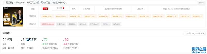 屈臣氏的这款“ 0糖0脂0卡气泡饮料 330ml*24罐”是该品牌的热销商品,2022年在京东平台上累计销售超91万件,累计销售额超8100万元。屈臣氏这款饮料的历史最低价为72元,最高价为92元。