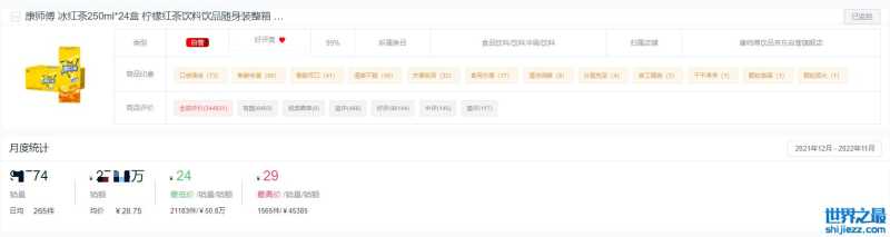 康师傅品牌中比较受欢迎的是这款冰红茶,今年在京东平台上共销售9.6万多件,累计销售额超276万元。这款饮料(250ml*24盒)的历史最低价为24元,最高价达29元。