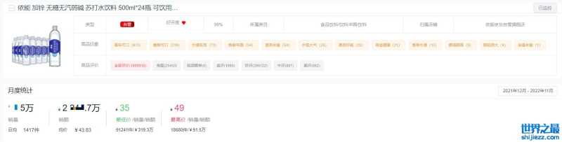 2022年,依能的这款无糖无气苏打水是年度热销第一的产品,在京东平台累计销售超51万件,累计销售额超2200万元。依能的这款饮料(500ml*24瓶)历史最低价曾降至35元,最高价为49元。