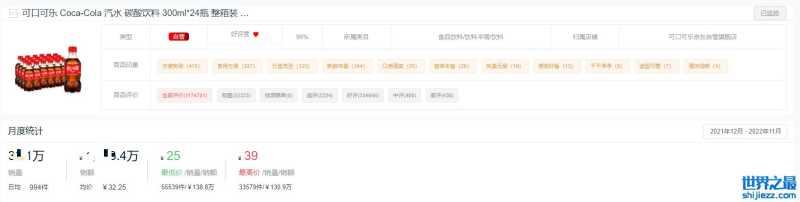 可口可乐的这款碳酸饮料是年度热销商品,在京东平台上累计销售超过36万件,累计销售额超1100万元。据统计,可口可乐这款饮料(300ml*24)的历史最低价为25元,最高价为39元。