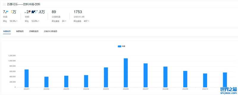 2022年在饮料领域可口可乐品牌整体销售成绩位列第一,全年总销量超1390万件,总销售额超5.7亿元。今年6月份,可口可乐的销售成绩达到全年最高,单月销量将近178万件,销售额超7100万元。目前在京东平台上,可口可乐饮料的相关店铺共203家,每个月动销sku数量共4794个。