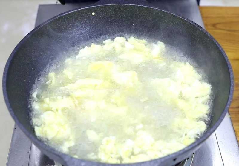 锅内再烧油,倒入半碗鸡蛋液煎一下,轻轻地搅动让鸡蛋液均匀受热,鸡蛋液全部凝固以后 用锅铲炒碎,倒入适量的开水,这一步一定要用开水,鸡蛋提前煎制再加开水炖煮,这样煮出来的汤才浓白鲜香。