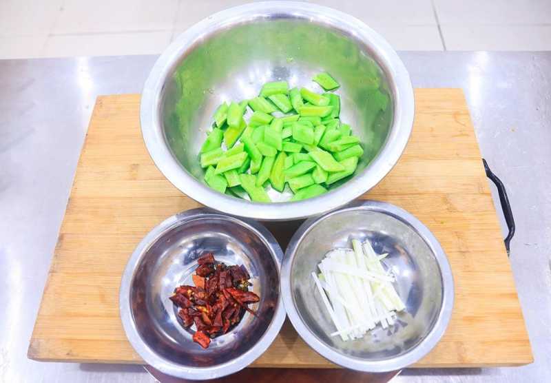 切点葱、姜,抓一把红干椒,把苦瓜焯一下水,再次减轻苦瓜的苦味。