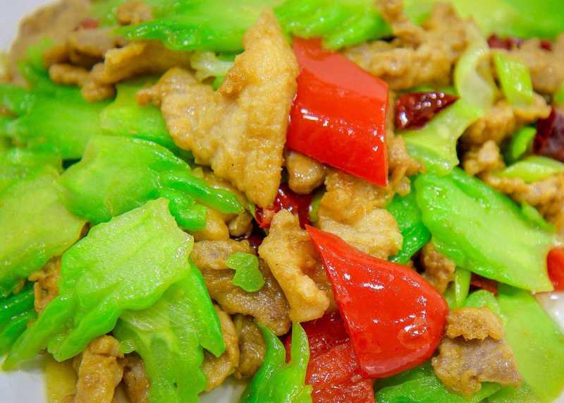 倒入葱姜红干椒翻炒出香味来,闻到葱香味的时候,倒入苦瓜和红椒,开大火翻炒,再倒入肉片,起锅淋入料酒。