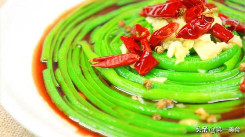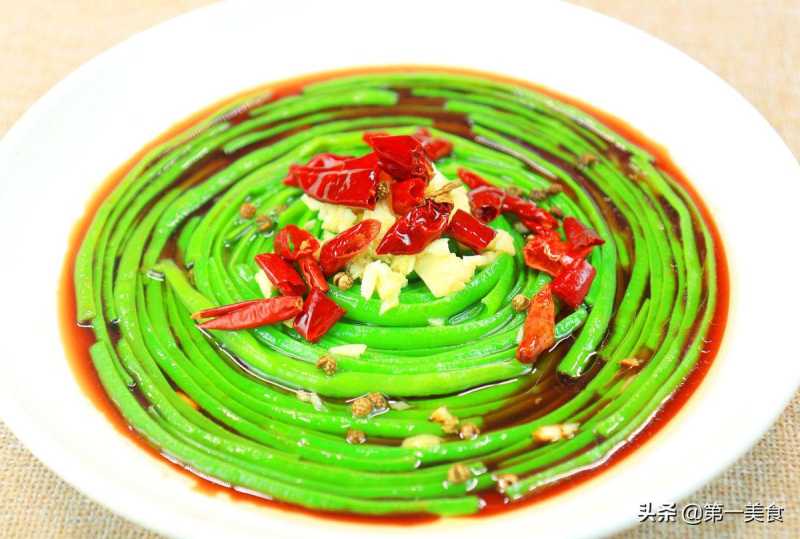 3.料碗浇在豆角上面,放上蒜末、干辣椒和麻椒。最后浇上热油,激发出香味,美味即成。
