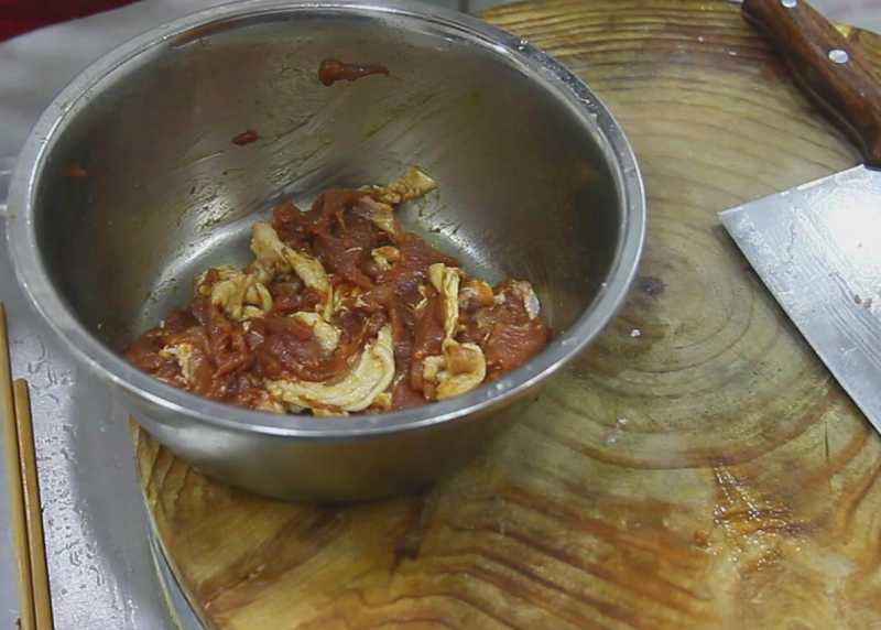 把猪肉放在盆中浆一下,炒出来不干不柴,加入食盐、胡椒粉、吡进去5毛钱的料酒,滴几滴老抽上底色,照着一个方向快速地搅拌给肉片上浆入味。
