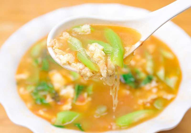 倒入番茄汁搅拌均匀,加入适量的食盐、鸡粉、胡椒粉、生抽调味,转大火炖煮,让营养融入到汤里面,放入丝瓜煮出清香味,大约煮个2分钟,倒入适量的面糊搅拌均匀,把汤汁收浓,这样喝起来更加的适口不会谢,最后淋上芝麻香油,撒上荆菜叶,一道鲜美营养的丝瓜鸡蛋汤就做好了。