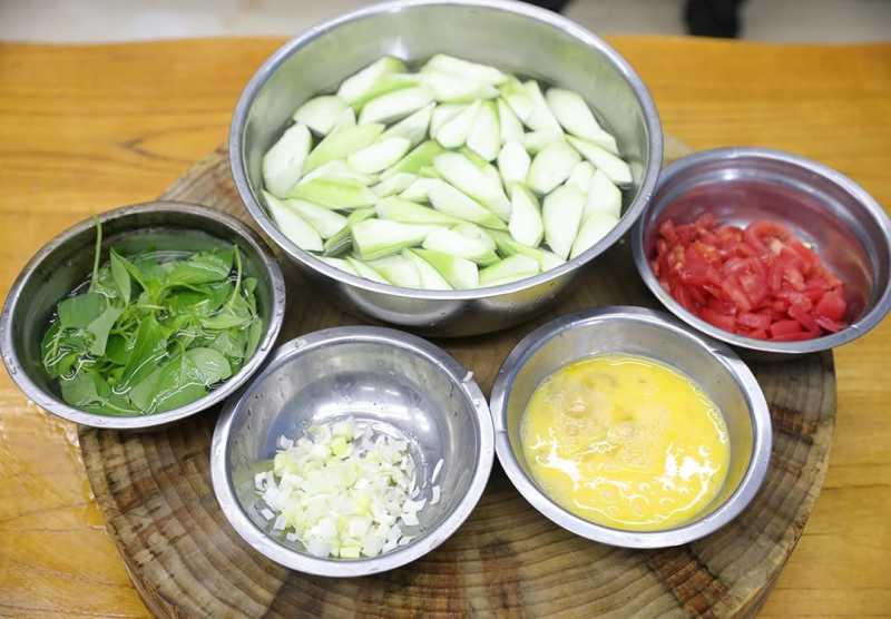 准备丝瓜两个,削去外皮切成均匀的滚刀块,放入清水中,淋入一点白醋防止氧化变黑。
