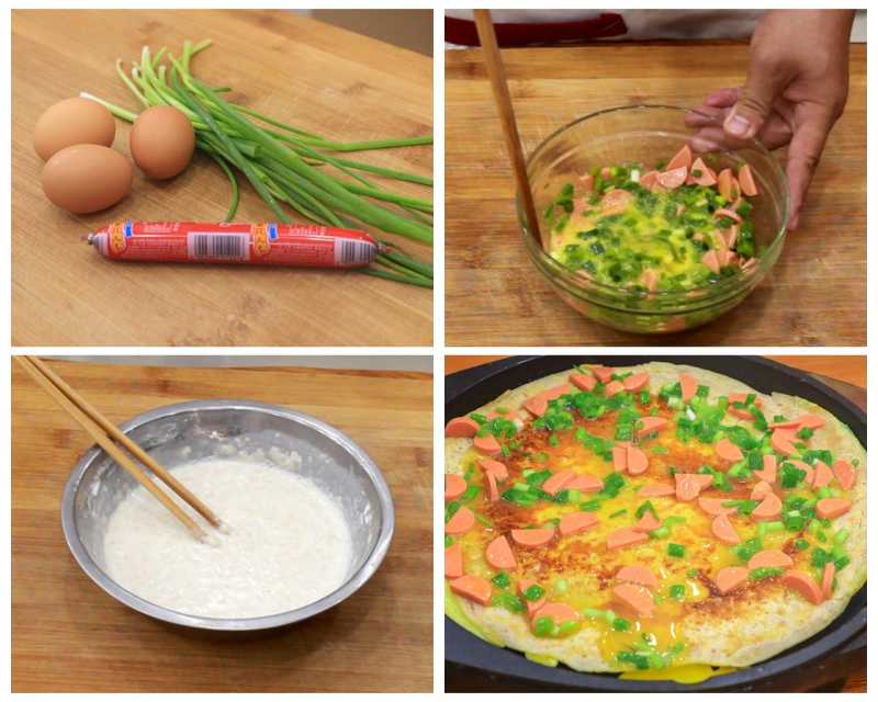 1、在碗中打入三个鸡蛋,小葱切成葱花,一根火腿切片。加入食盐2克,搅拌均匀备用。燕麦片200克加入纯牛奶100毫升,面粉30克搅拌。再加入100毫升的清水,调成稀一些的面糊备用。