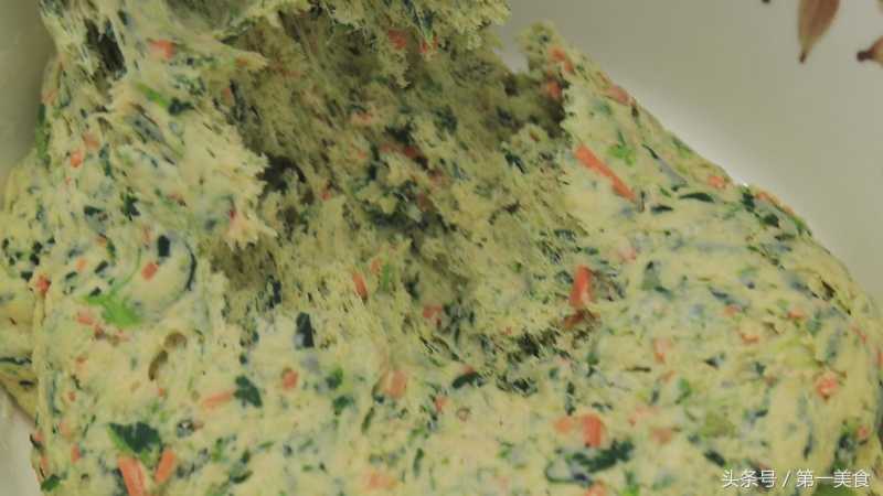 青菜切成青菜碎放在盆中,胡萝卜半根,先切成薄片再改刀切成细丝,最后切成胡萝卜碎与青菜碎一起放在盆中。