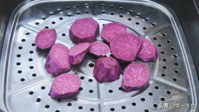准备紫薯一个,切成块,放在锅上蒸熟。蒸熟以后盛出放在小盆中,加入少量的白糖,用勺子按压成紫薯泥