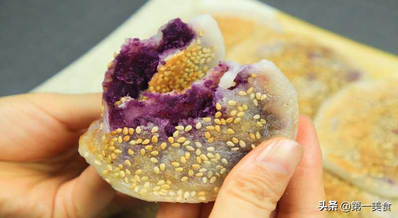 揪下一个糯米剂子 在手中团一团,手里可以沾上一点植物油防止面粘到手上,按成一个片,包上紫薯泥 。