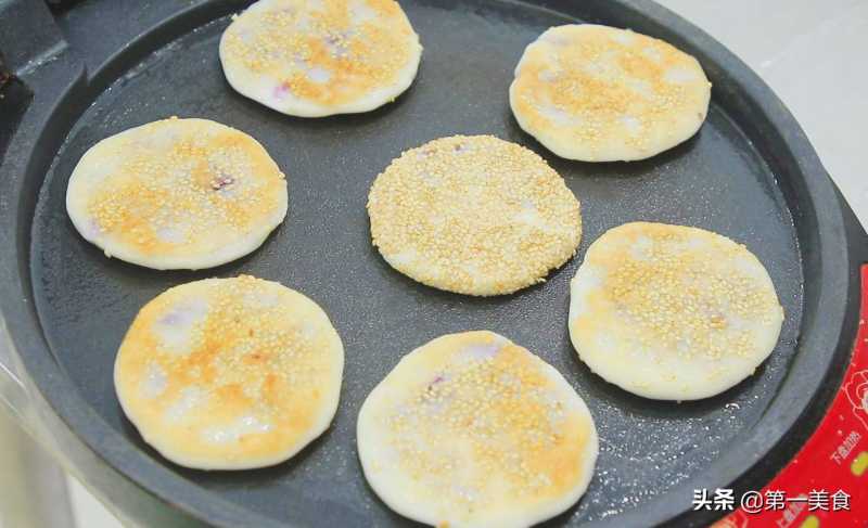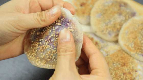 然后封口,封住口以后,再按压成一个小糯米饼,两面粘上芝麻。