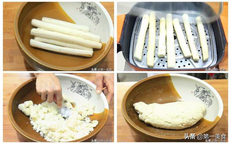 3.15分钟以后把山药取出来、放入盆中,用勺子摁压成细腻的山药泥,放在一边晾凉。