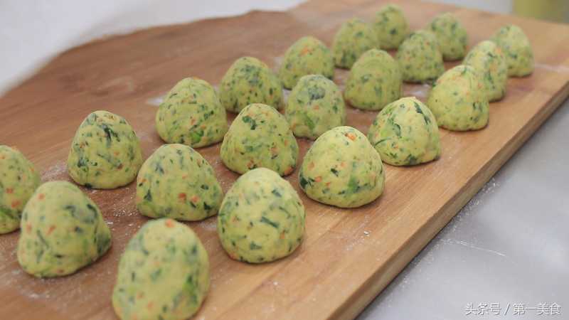 取出面团,放在案板上面揉成长条,然后揪成一个一个的小剂子。手上蘸点油,不容易沾。用左手虎口和右手的大拇指把面团搓几下,在面团的底部用手指转出一个洞。