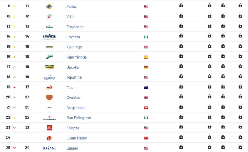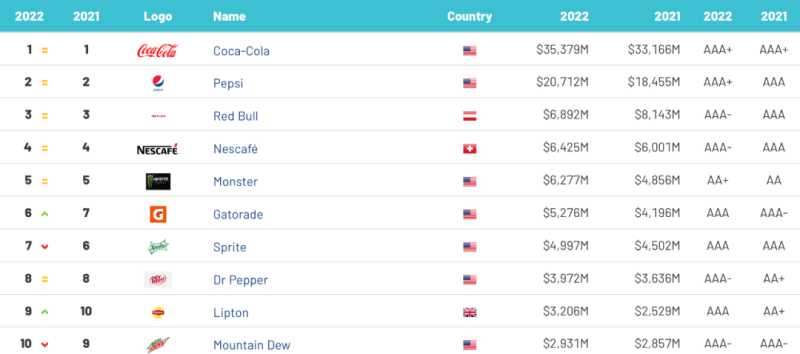 在“全球软饮料品牌价值25强”榜(Non-Alcoholic Drinks 25)上,可口可乐、百事可乐和红牛依旧名列前三位。25个上榜品牌总价值1152亿美元。