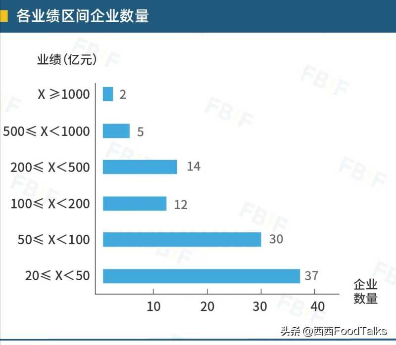 此外,相较FBIF2021百强榜,50-100亿元业绩区间的企业从28家上升到30家,20-50亿元业绩区间的企业则从41家下降到37家。百强榜企业的整体规模也逐渐向百亿级靠近。