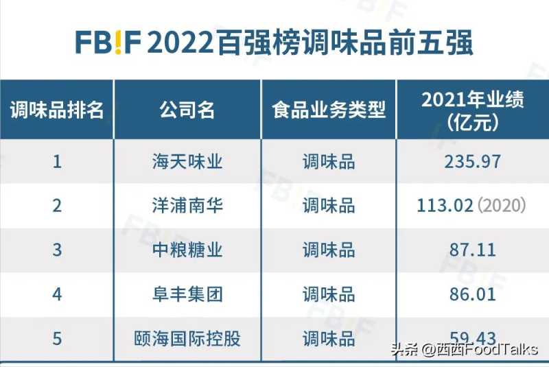 在FBIF2022百强榜的调味品前五强中,海天味业以235.97亿元业绩排名第一。洋浦南华、中粮糖业、阜丰集团、颐海国际控股分别位居品类第二至第四。
