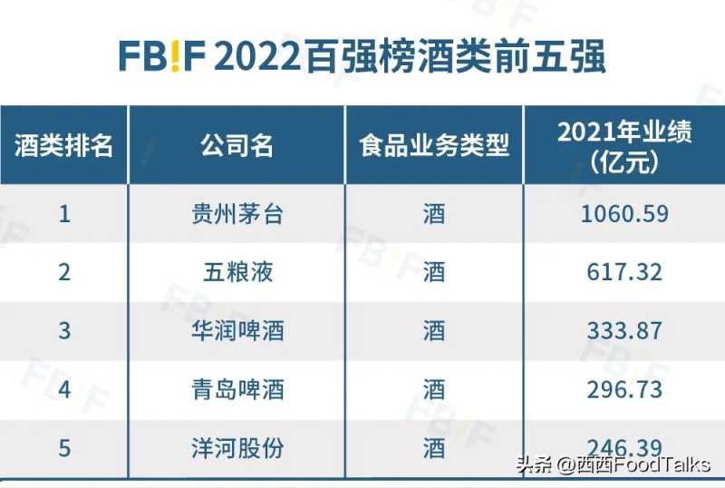 在FBIF2022百强榜的酒类前五强中,贵州茅台以1060.59亿元业绩位居第一、五粮液以617.32亿元业绩排名第二。华润啤酒、青岛啤酒、洋河股份分列酒类第三至第五位。