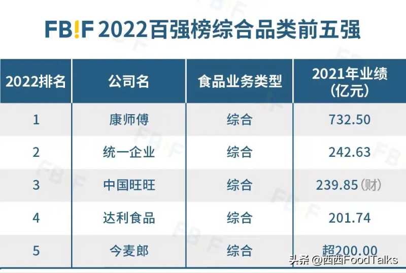 从FBIF2022百强榜来看,康师傅、统一企业、中国旺旺、达利食品、今麦郎位居综合品类前五。综合品类前五强企业在食品和饮料赛道上,都拥有各自的核心产品,并提供多种口味、规格的产品给消费者。