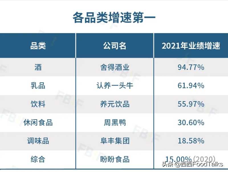 不同品类的业务情况不同,我们也从FBIF2022百强榜的主要品类中,一起来看各品类的增速情况。各品类增速第一的企业分别为:舍得酒业(酒)、认养一头牛(乳品)、养元饮品(饮料)、周黑鸭(休闲食品)、阜丰集团(调味品)、盼盼食品(综合)。