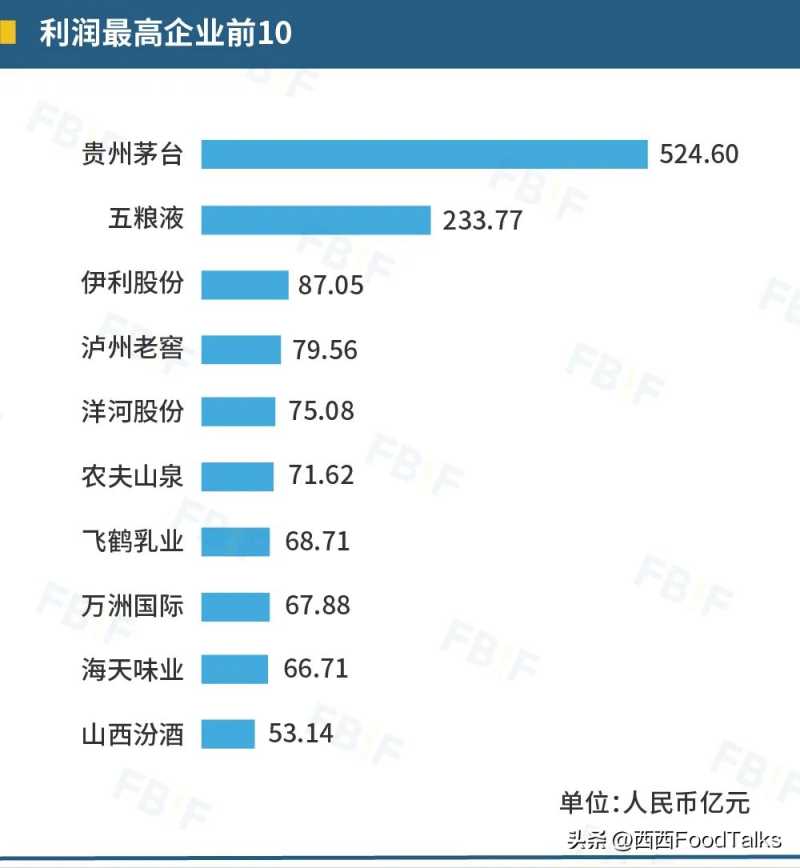 FBIF2021百强榜的利润榜被酒类占领,“茅五洋”(贵州茅台、五粮液、洋河股份)为前三甲。而在FBIF2022百强榜中,贵州茅台以524.60亿元的利润蝉联榜首,五粮液以233.77亿元的利润保持第二。此后,伊利股份以87.05亿元的利润首次进入利润榜第三名,超越了泸州老窖(利润榜第四)和洋河股份(利润榜第五)。
