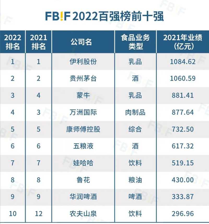 2022中国食品饮料百强榜发布伊利、茅台业绩破千亿,农夫山泉前十