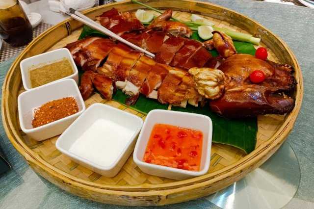 脆皮烧鹅是粤菜经典中的经典,制作难度极高,在粤菜中具有举足轻重的地位,是最能代表粤菜的名菜之一。脆皮烧鹅精选广东清远脂肪丰满、油脂鲜嫩的黑棕鹅,属于最上等食材,做出来的烧鹅外皮甜美香酥,肉质细嫩多汁,入口油润丰腴,唇齿留香。