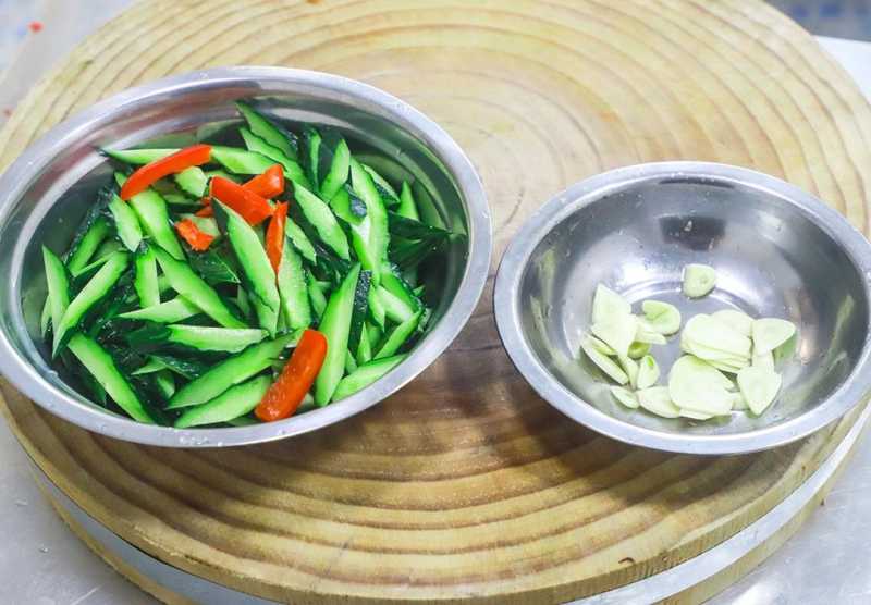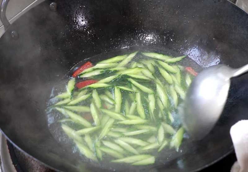 锅内烧水,加入少许的植物油和食盐入底味,植物油能保持黄瓜青翠的色泽防止营养成分流失,水烧开以后倒入切好的黄瓜、红椒焯水1分钟左右,黄瓜返青后倒出来,用清水冲洗,冷却控水。