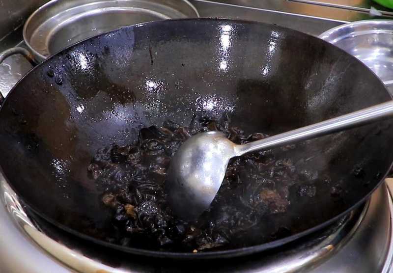 锅内留底油,倒入木耳煸炒一会儿,把里面的水分炒出来,听到有噼啪的声音就可以了,加入生抽5克,淋入一点清水,加入胡椒粉2克,蚝油3克,翻炒化开调料,淋入少许葱油增香提色,翻匀以后盛出来备用。