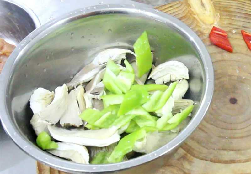 锅内烧油,烧到冒烟,倒出热油加入凉油,热锅凉油倒入肉片翻炒,炒至变色以后,加入葱姜、蒜、干红椒,翻炒出蒜香以后加入适量的蚝油,翻匀后倒入蘑菇、青红椒,加入适量的食盐,鸡粉,胡椒粉,料酒,翻炒化开调料,勾入水淀粉,大火收汁后即可出锅。