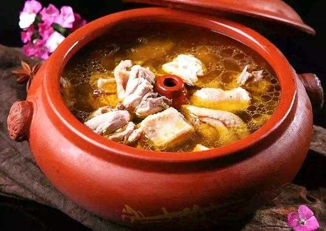 盗汗鸡之所以有名是因为使用的炊具有特色,所谓盗汗鸡就是用盗汗锅制作出来的鸡肉和鸡汤。盗汗锅是贵州当地的一种用土陶制作成的炊具,是由底座、蒸钵、顶锅和顶盖四个部分组成的。这道菜是将老母鸡清理干净后放在盗汗锅里,然后加入党参、红枣、枸杞等多种食材一起蒸制而成,在蒸制的过程中不加一点水,但是蒸好后里面的汤汁却很多,这些都是从锅上流下来的蒸汽,所以取名盗汗鸡。鸡肉吃起来肉嫩鲜香,鸡汤喝起来也是无比鲜美。