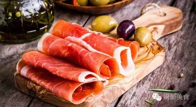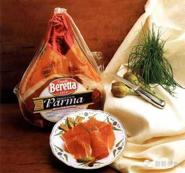 上好的帕尔玛火腿至少要有9公斤以上,其色泽粉嫩如玫瑰一般,脂肪分布均匀,口感于各种火腿中最为柔软。更多精彩内容请关注微信公众号:厨影美食。切片后有透视感,带云石纹理的脂肪,嗅起来有陈年的肉香及烟熏的气味,味道咸香,入口即化。在意大利,能否提供优质的帕玛火腿,几乎成为评价餐厅素质好坏的标准。