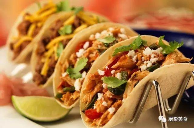 墨西哥卷饼(Taco),有时音译为“塔可”等,是墨西哥的传统食品。正宗的Taco,饼皮非常重要,讲究的小店都会现做皮,用得还是黄黄的玉米粉。这样做出的饼皮不仅绵软有嚼劲,还有烤玉米的清香,又能吸收更多的肉汁。其次,Taco所卷的肉也不能马虎。更多精彩内容请关注微信公众号:厨影美食。其非常讲究肉本身的质感和各种不同的炖、烤、煎的制作方法,烤牛肉、猪肉、鸡肉、牛脸肉、牛舌都是最基本的选择,甚至于什么肉什么部位应该用怎样的香料都有自己的讲究。在taco上撒上足量的自制沙沙酱,咬一口taco,肉汁顺着你的指尖流下,酸辣的沙沙酱在口中爆炸,连着脂肪和淀粉带给你的满足感。