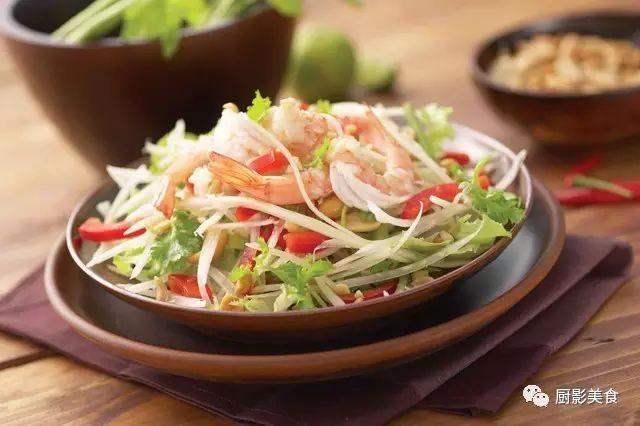青木瓜沙拉是泰国人很喜欢的一道开胃小菜,也是泰国十大名菜之一,从原材料到做法都极具泰国风情。青木瓜是亚热带的特产,和国内的水果木瓜是近亲,不同的是,青木瓜的体积大,类似西葫芦,削去青绿色的皮,里面是嫩白的果肉,吃起来清脆中略带一点韧劲儿,微甜中又有一丝清苦。