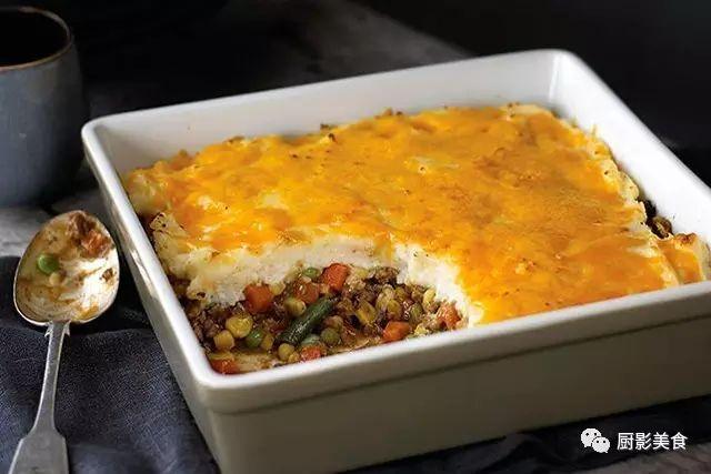 牧羊人派是英国的一种传统料理。它并不像西点中的派一样有酥皮,而是用土豆、肉类和蔬菜做的不含面粉的派,被当作主食。烤出来香气四溢,而3个土豆和适量的牛肉、蔬菜就能让你美美地饱餐一顿,增加用量和使用大烤盘时,也适合用来招待多人。