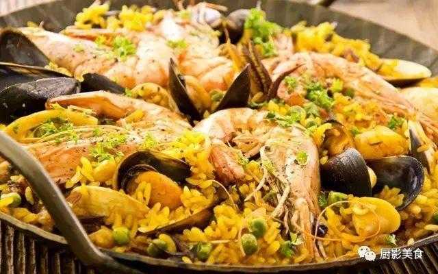 西班牙海鲜饭,西餐三大名菜之一,与法国蜗牛、意大利面齐名。西班牙海鲜饭英文为paella,但 paella 这个词原意是平底锅,直到1840年这个词才特指代海鲜饭。海鲜饭发源于西班牙valenciana,盛产欧洲少见的稻米,从16世纪开始,当地居民喜欢把米、肉、菜炖在一起吃,这就是 paella 的原型。