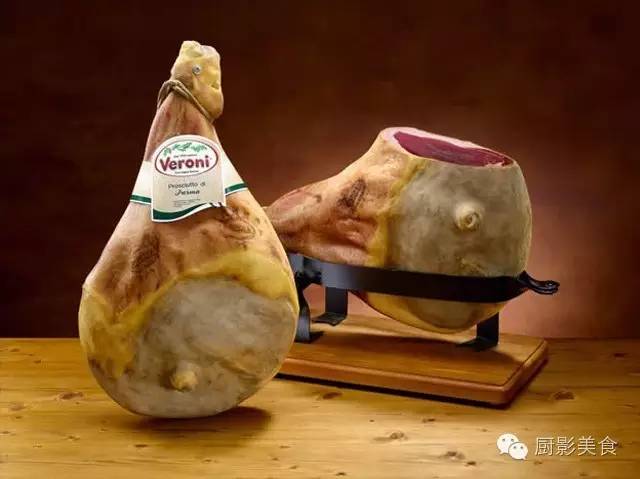 帕尔玛火腿必须经过盐腌、风干、熟成三个阶段。采用传统的意大利特有猪种杜洛克猪或是长白猪,养足9个月,体重超过150公斤,这时的猪后腿每只超过15公斤,腌制时不添加任何香辛料及添加剂,仅添加粗盐,使用传统工艺制作。更多精彩内容请关注微信公众号:厨影美食。将腌制好的火腿挂在制作区域风干,帕尔玛地区的山谷常年有微风,而且充满了栗子树的气味,这是这样特殊的地理条件赋予帕尔玛火腿绝佳的风味。帕尔玛火腿的熟成时间一般都在一年以上,由自然的温度和湿度变化来熟成。