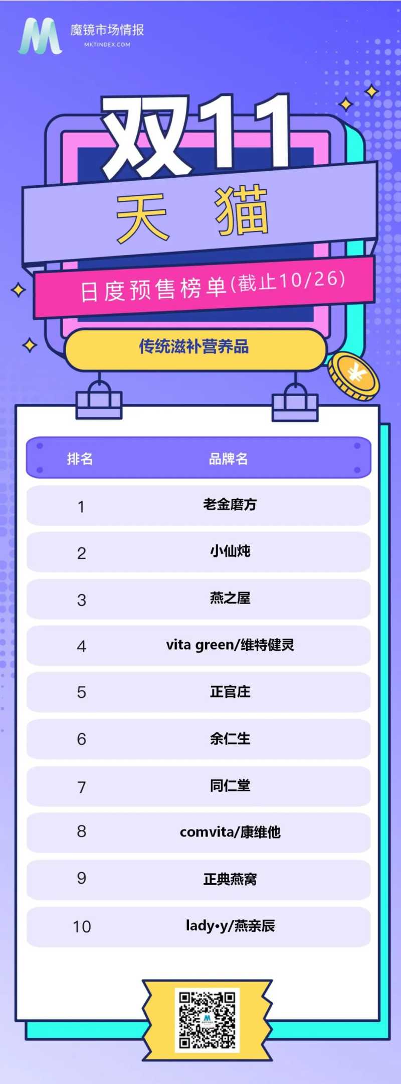 今天,魔镜市场情报为大家盘点一下食品饮料、医药保健行业中,天猫平台截至10月26日累计销售额品牌排行。