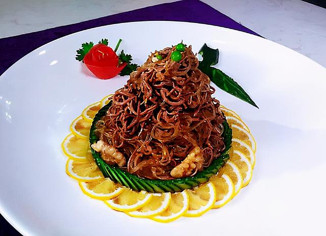 温拌腰丝也是一道很有历史的名菜,是由唐代的羊皮花丝演变而来的。这道菜的食材看起来很简单,主料就是猪腰和粉丝,但是制作起来却非常考验厨师的技术,特别是刀工上的要求很高,需要把猪腰去膜然后切成细丝,然后用温拌的技法制作而成,吃起来脆嫩爽口,闻起来香味扑鼻。