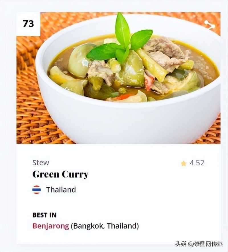 此外,在“美食地图网”公布的100道全球最佳传统美食榜单中,泰国有3道菜品上榜,它们分别是位列该榜单第6名的泰式浓香红咖喱(4.8星),位列第40名的玛莎曼咖喱(4.6星)以及位列第73名的泰式绿咖喱(4.52星)。