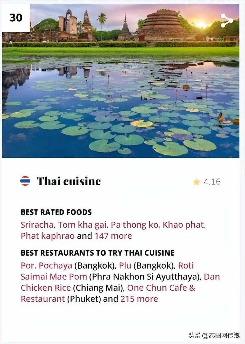 近日,著名美食点评机构“美食地图网”(tasteatlas)发布了一份“全球美食排行榜”,泰国则以4.16(满分等5分)的分数登上该榜单第30名,位居全球第一的则是意大利(4.72分)。