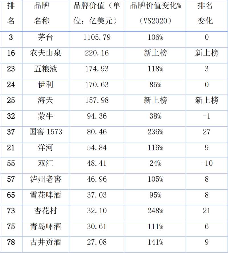 其中在100强中,有14家食品饮料企业上榜,茅台稳居第一,农夫山泉作为新上榜品牌紧随其后,除此之外,海天以157.98亿美元的品牌价值同为新上榜企业,杏花村品牌价值更是暴增248%,排名提升21位,14家企业中酒企有8家,展示出强劲实力。以下为具体: