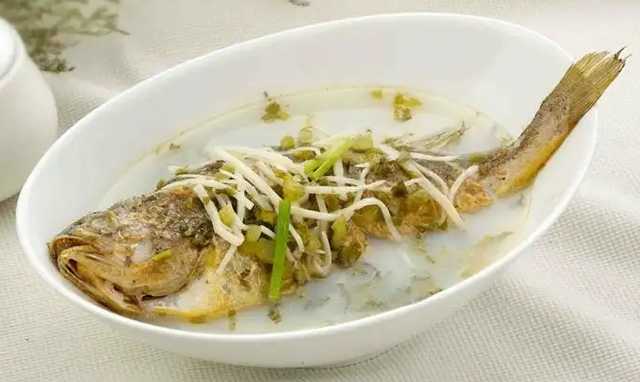 咸齑[jī] 大黄鱼可以说是宁波人逢年过节招待客人在餐桌上必不可少的一道名菜,它是用一种优质的咸齑采用古法腌制的方法,去烧制大黄鱼,做出来的鱼肉鲜嫩可口,汤汁微咸带酸,鲜味十足。