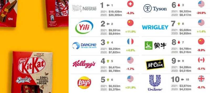 在首次公布的全球食品品牌价值100强(Food 100)榜单上,雀巢、伊利、达能名列前三位。100个食品品牌总价值2210亿美元。中国上榜的10大品牌为:伊利、蒙牛、海天、统一、康师傅、旺旺、光明乳业、双汇、万洲国际和中粮。