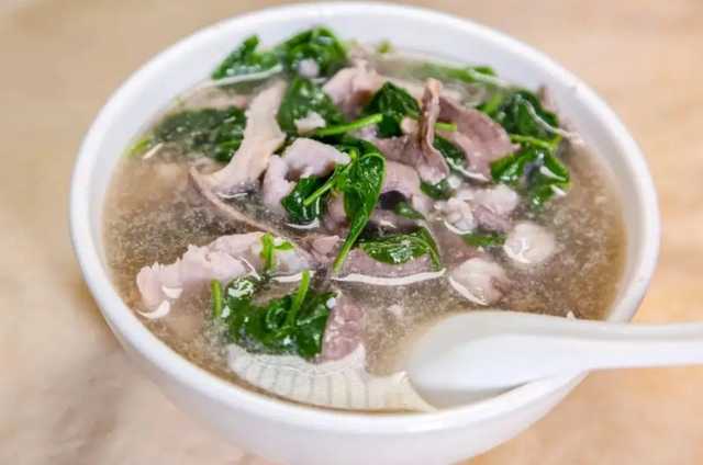 三及第汤是一道非常典型的客家菜,它主要是用猪肝、猪瘦肉、猪肚这3种食材,搭配上咸菜、枸杞叶等铺料,再搭配上一些酒糟制作而成的美味鲜汤,也是梅州客家人吃早餐的最爱美食,喝此汤,还能清肝明目。